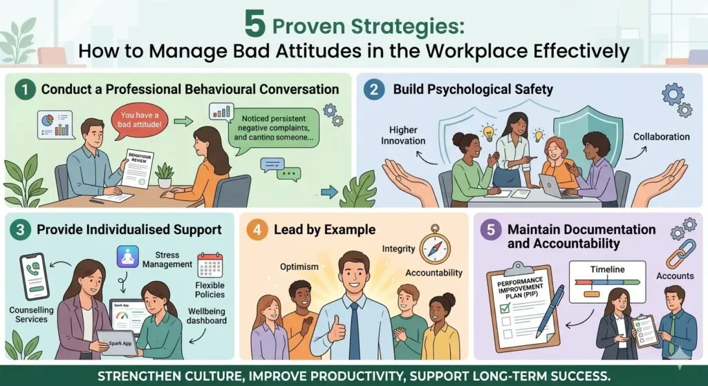 Managing workplace negativity requires a structured and empathetic leadership approach. The following five strategies help managers address behavioural challenges while maintaining a supportive and productive workplace culture.
